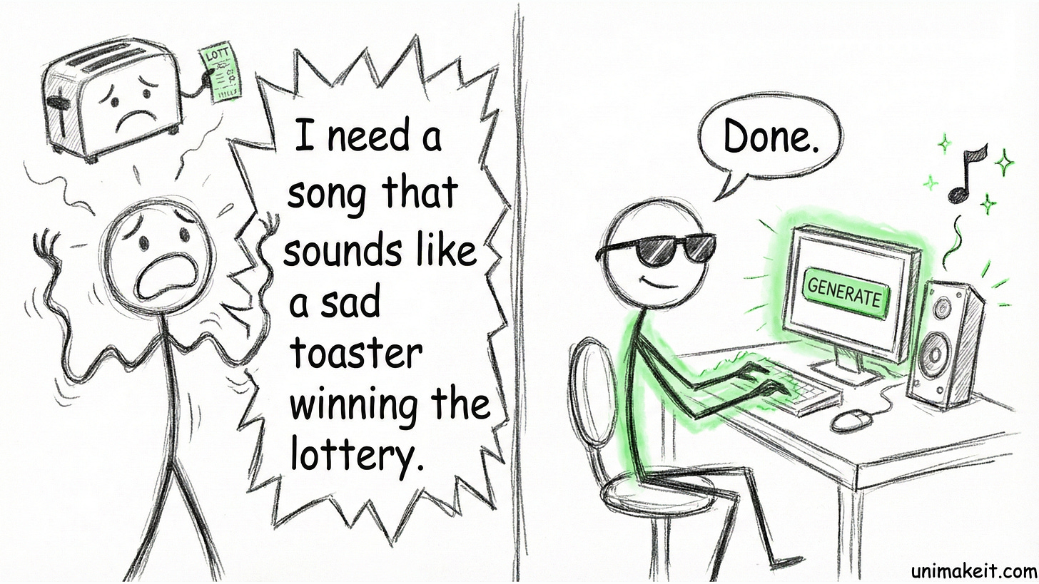 Today, we are filling a vacancy in the Audio Department. Usually, getting custom music for a client presentation, a product launch, or a social ad involves three bad options: paying a composer thousands, risking a copyright strike, or using that same generic ukulele track everyone else uses.