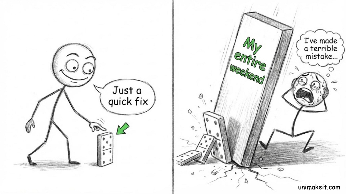 One tiny error—like a cabinet not fitting in your kitchen reno—triggers a domino effect that ends with you rewiring the entire electrical grid of your house.