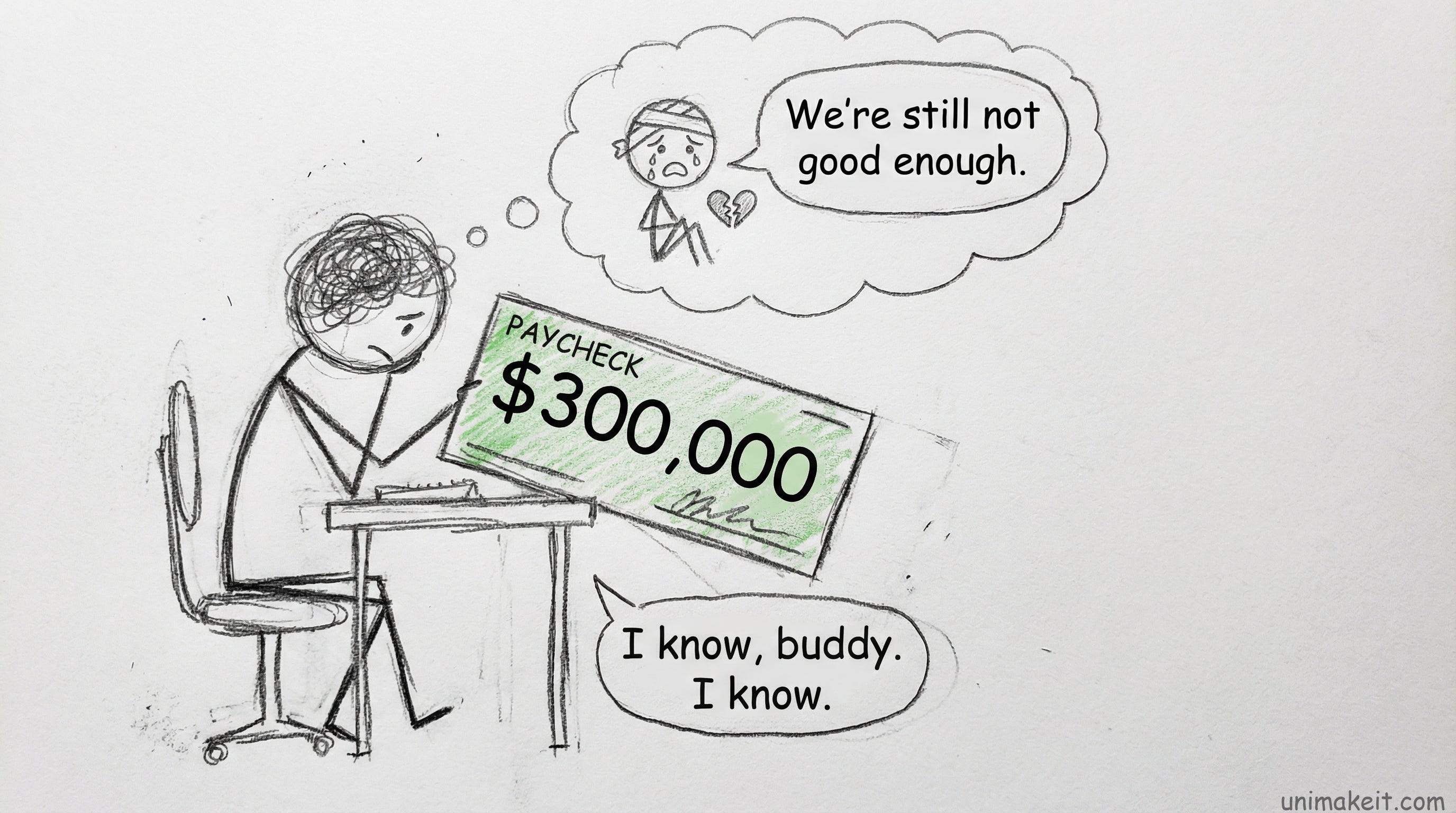 The Wounded Child feels inadequate. I once met someone making $300K who still felt “not good enough” because she grew up poor. The bank account changed. The feeling didn’t.
