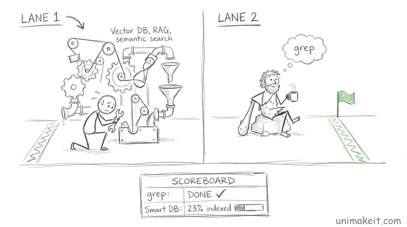 Option B: Delete all the RAG code and just let Claude search with grep and bash. This is caveman simple. This seems worse. Grep is brute force. It’s slow. It’s expensive (more tokens, more API calls).