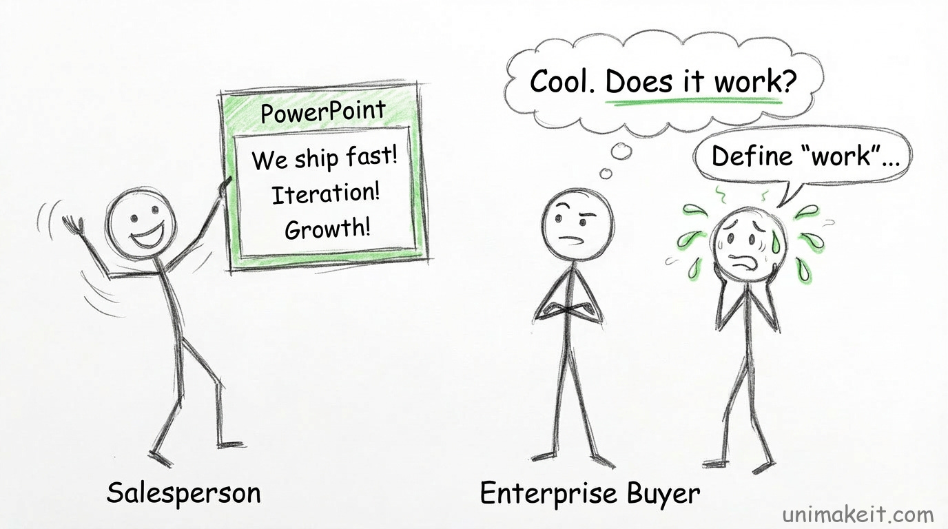 Because enterprise buyers care if your thing works, not how fast you shipped.
