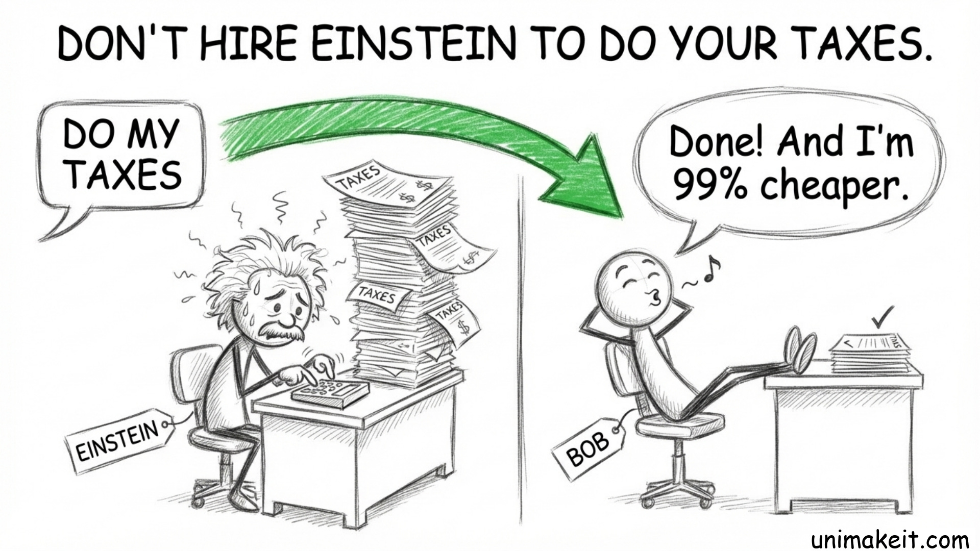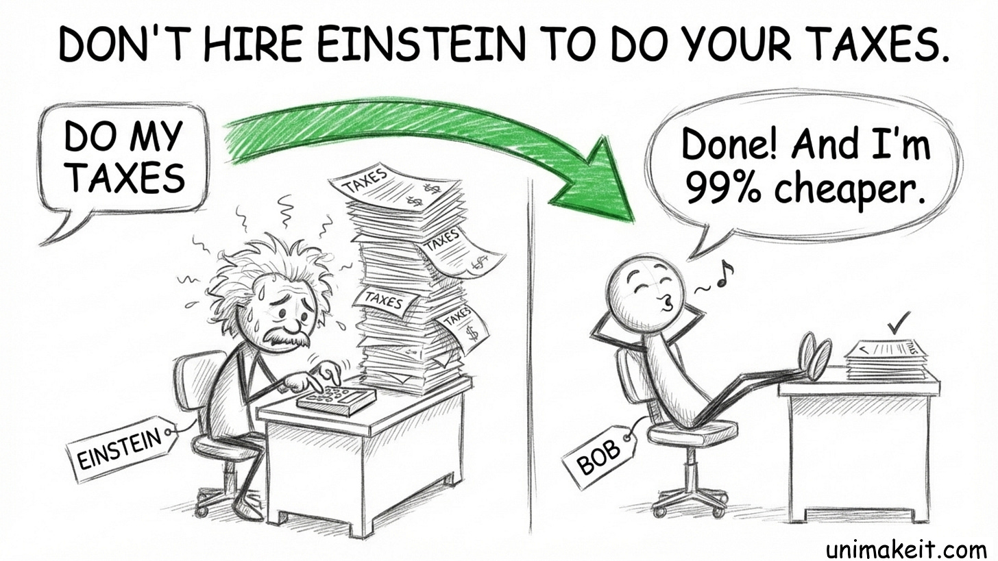 Sure, he can do them. But he costs a fortune. Meanwhile, there’s a guy named Bob (a smaller model) who is actually better at taxes than Einstein, and he costs $5.