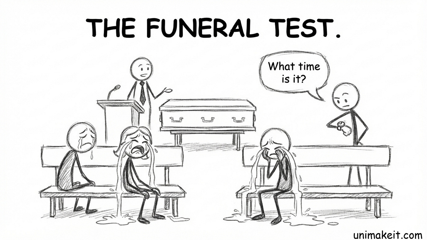 Close your eyes (after you read this sentence). Imagine your funeral. Who is sitting in the front row? Who is actually crying versus just checking their watch?