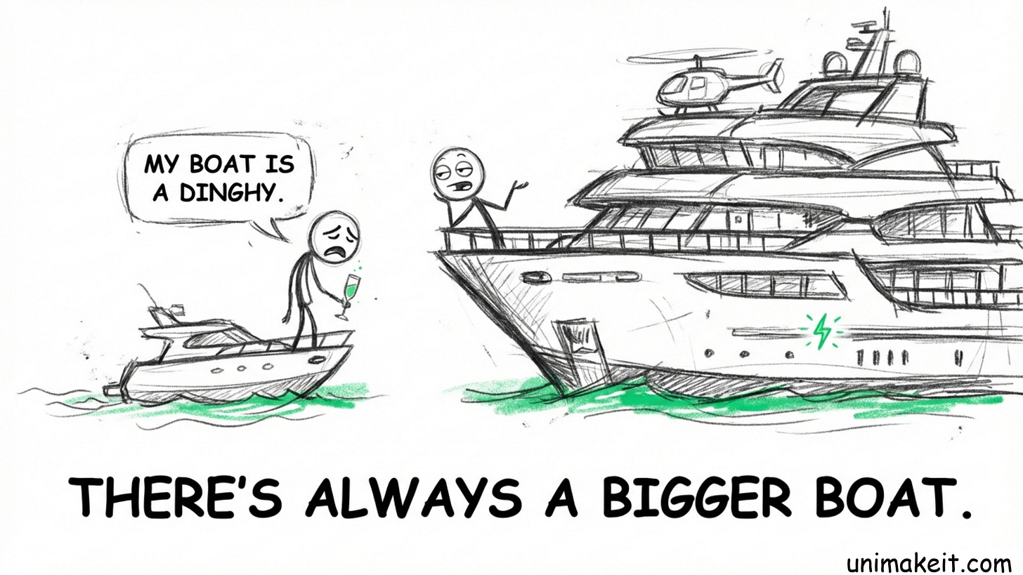 This is why the Financial Wealth scoreboard is broken. There is always a bigger boat. There is always a guy with a helicopter pad. If you are only optimizing for the “Money” column in your life spreadsheet, you are playing a game you are mathematically guaranteed to lose.