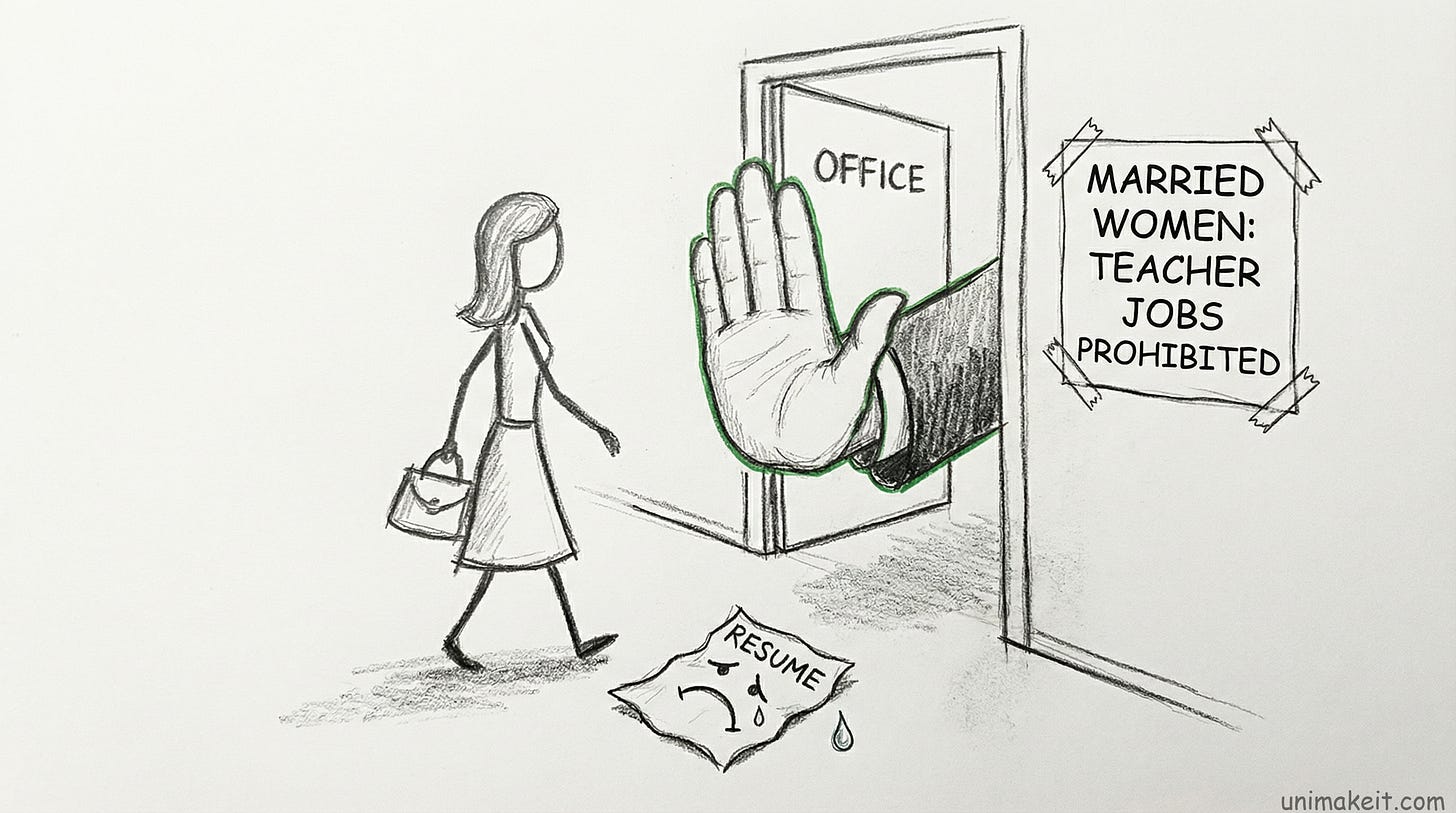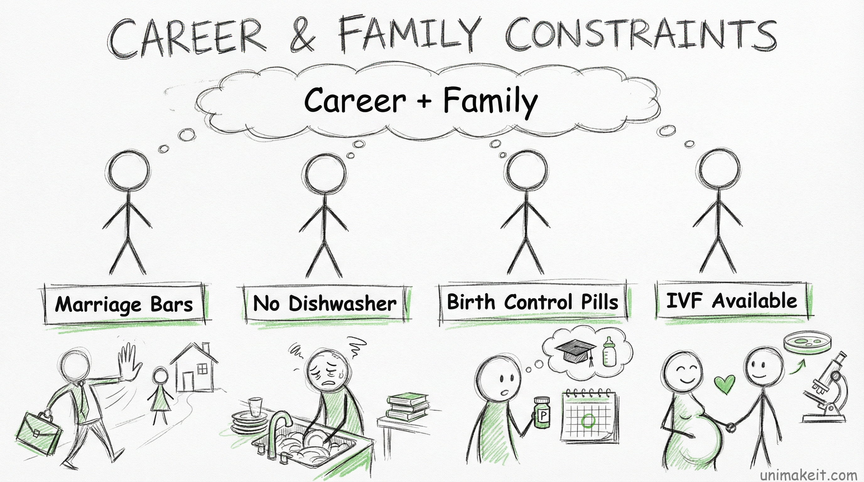 Generation 1 faced “marriage bars” – actual policies banning married women from certain jobs. Plus no washing machines, so laundry took 6 hours. Choose one: career or family.