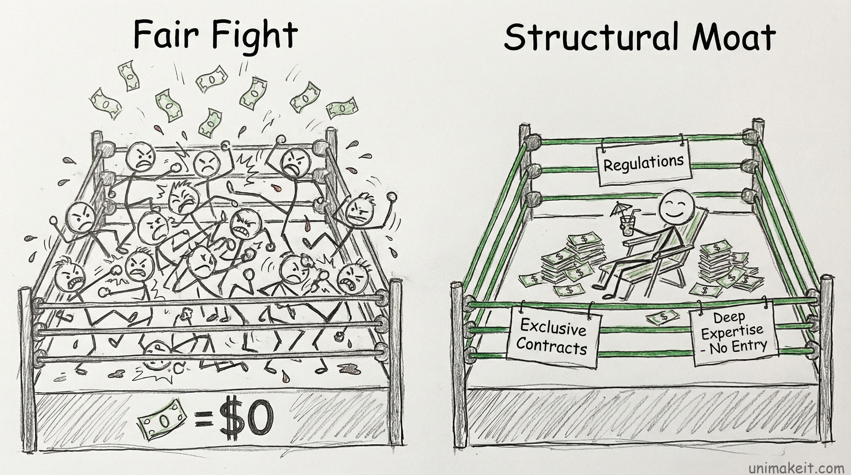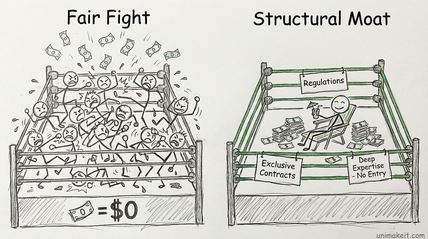 Data suggests we should be building boring, defensible advantages in markets with structural protection from competition.