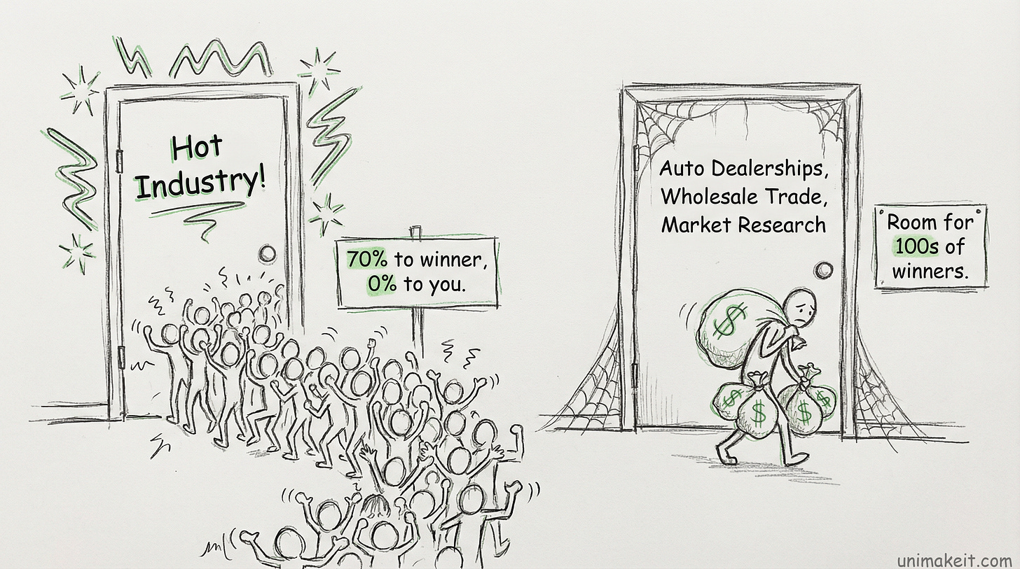 Industries where no single player devours the entire market. Where there’s room for hundreds of successful operators.